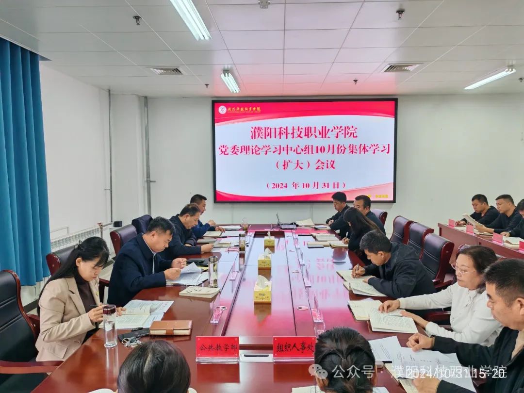 10月31日下午,濮阳科技职业学院召开党委理论学习中心组10月份集体学习(扩大)会议,深入学习贯彻习近平同志《论教育》和全国教育大会精神。党委书记郝胜锋主持会议并讲话,党委副书记、院长刘琰,副院长李栋,院领导魏荣华参加会议并依次发言,各部门负责人及全体党员参加。