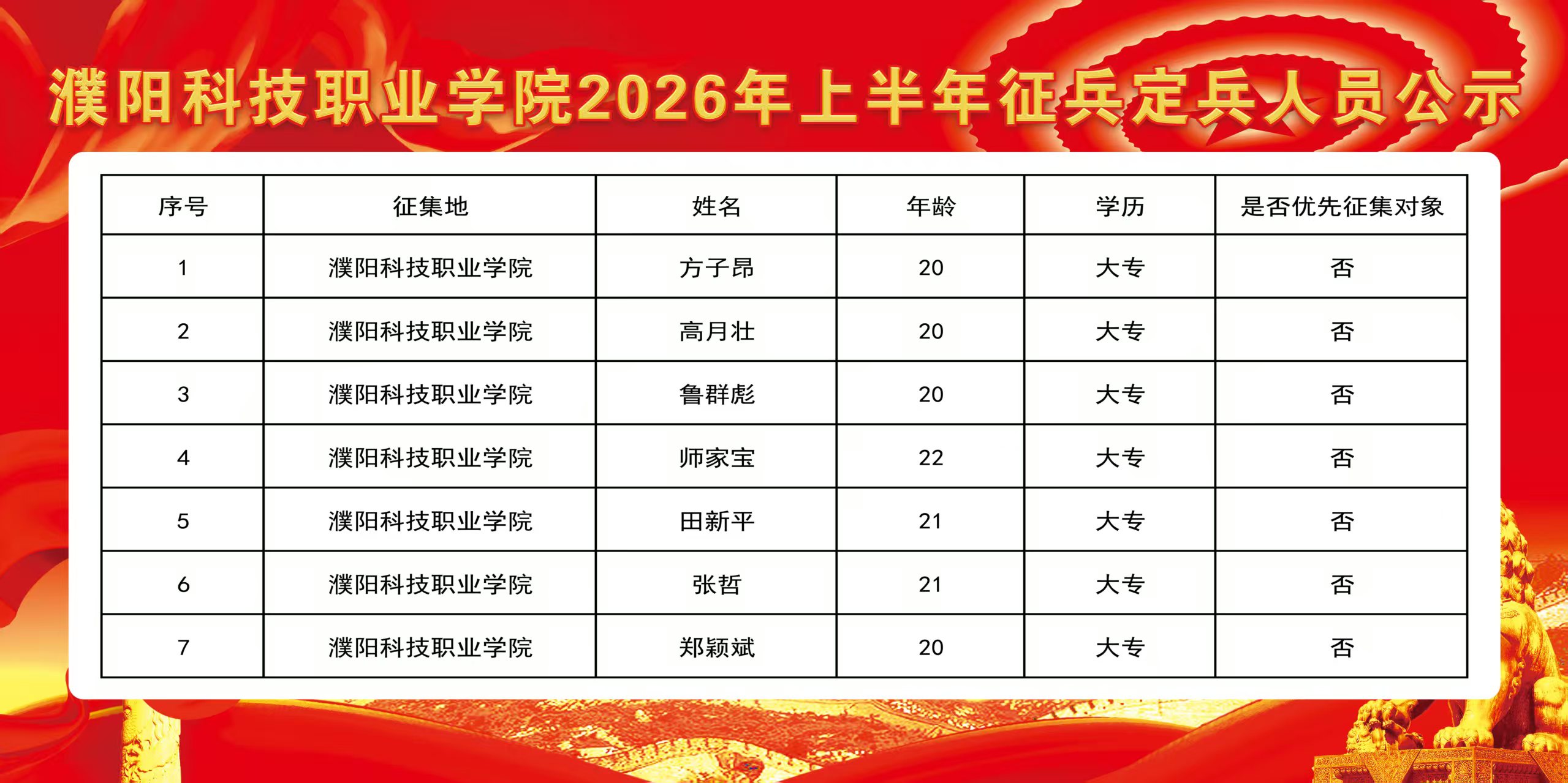 濮阳科技职业学院2026年上半年征兵定兵人员公示